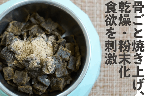 きめ細やかなパウダー状なので、ドライフードやウェットフード、手作りごはんなど、いつもの食事にさっと振りかけるだけで簡単にお使いいただけます。食が細い子や、歯が弱くなったシニアのペットにも安心して与えることができ、水分補給として水に溶かして与えるのもおすすめです。