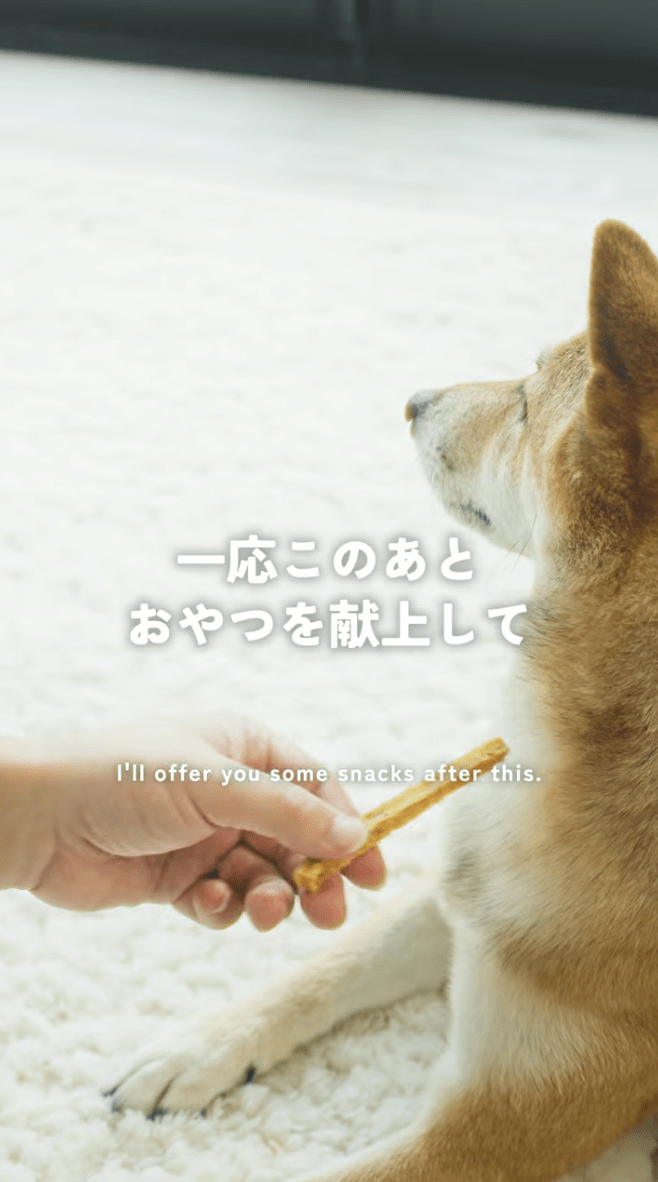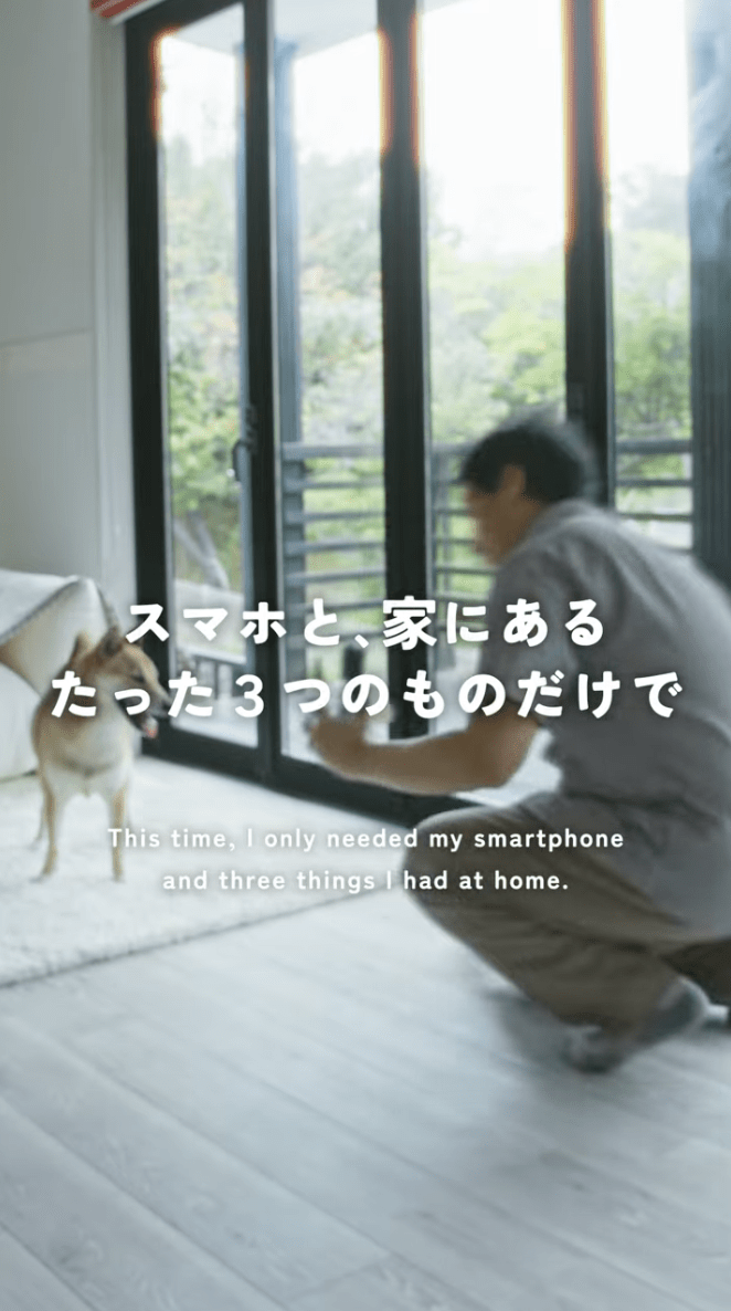 2. スマホと家にあるもので、誰でも「映画のワンシーン」を再現 特別な機材は必要ありません。使用するのはスマートフォンと、どこのご家庭にもある身近な道具だけ。映画のワンシーンのような情緒的な映像や、憧れのクリエイターの映像表現を、一般の飼い主様が真似できる「撮り方のコツ」としてわかりやすく紹介します。 第一回目は、あのお鼻が大きく見えるドアップ構図の簡単な撮り方をお伝えしています。