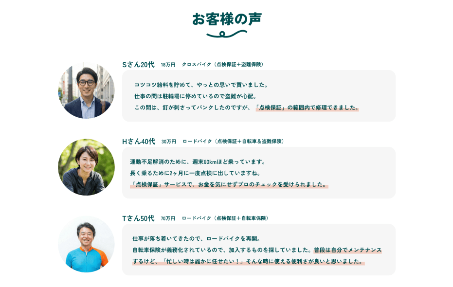 「18万円のクロスバイク」「70万円のロードバイク」など、実際の加入者がどのプランを選び、どのように点検保証を活用しているかを紹介。ご自身の車種に近い事例を参考にできます。