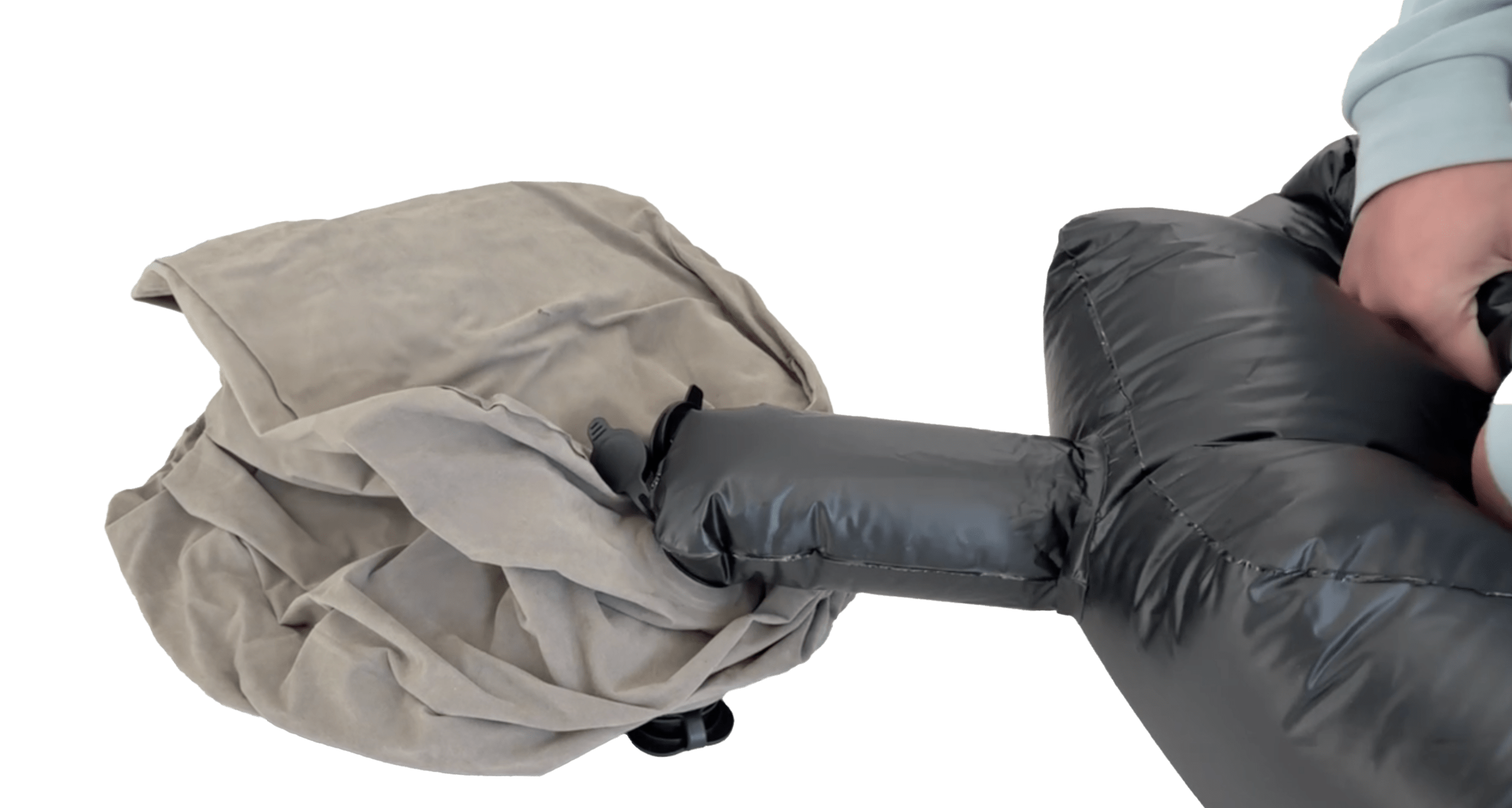 収納袋がポンプ代わりになる一体型構造を採用し、収納袋を広げて巻くだけのスマート設営方式です。口で膨らませる必要がなく、わずか30秒で完成します。ポンプ式と異なり空気を入れる音が静かなため、飛行機や夜行バスなどの静かな車内でも周囲を気にせず使用可能です。